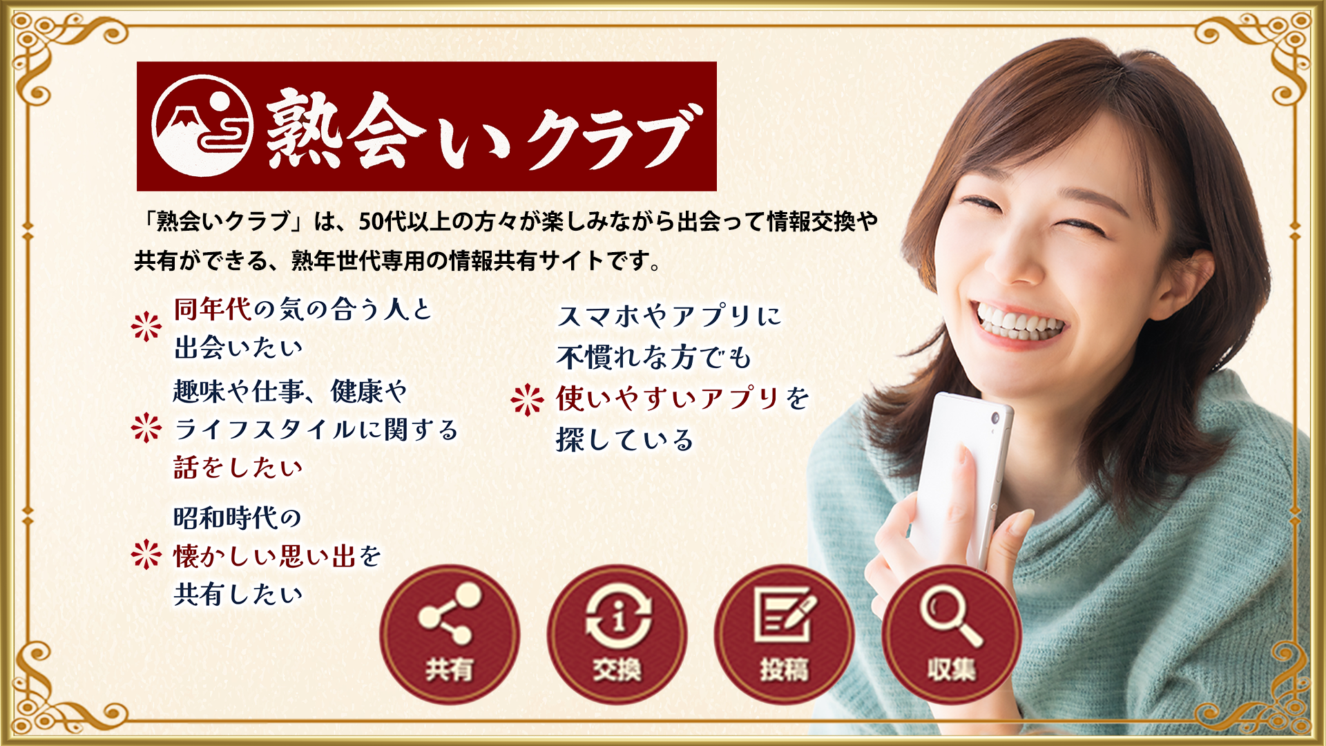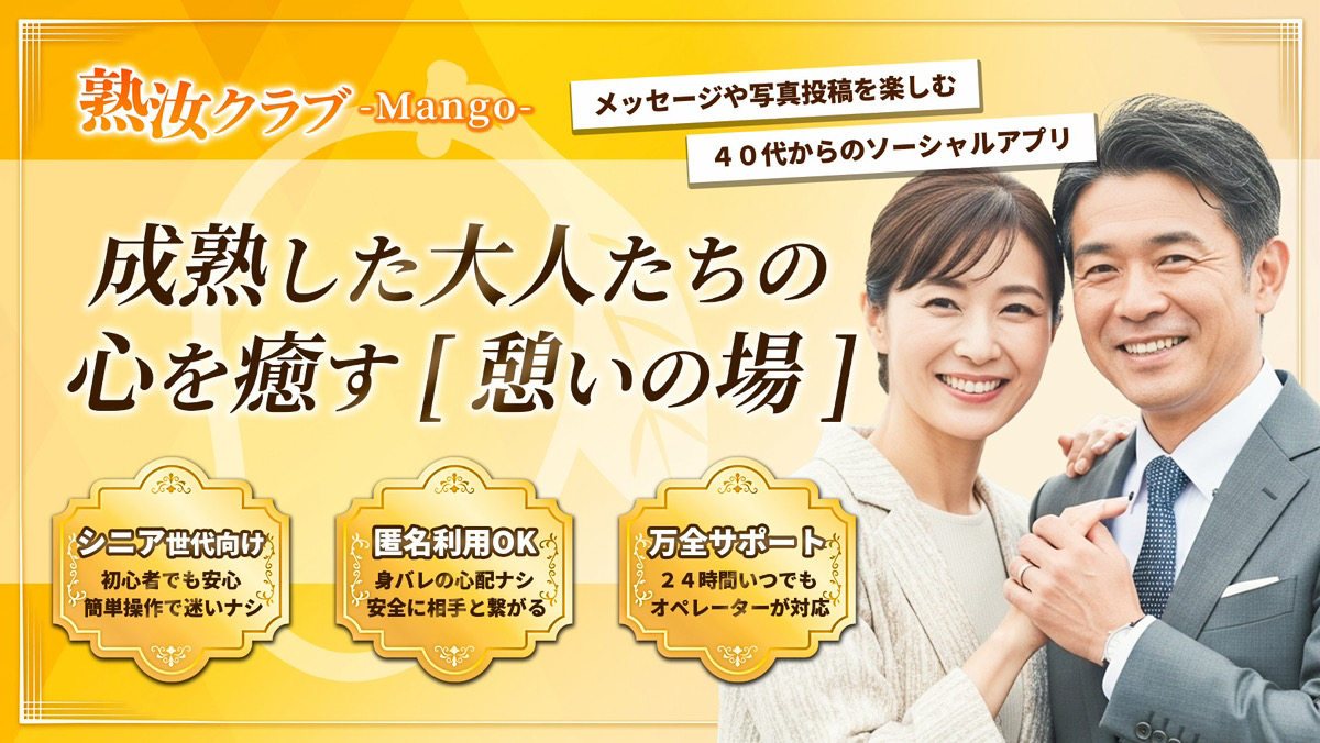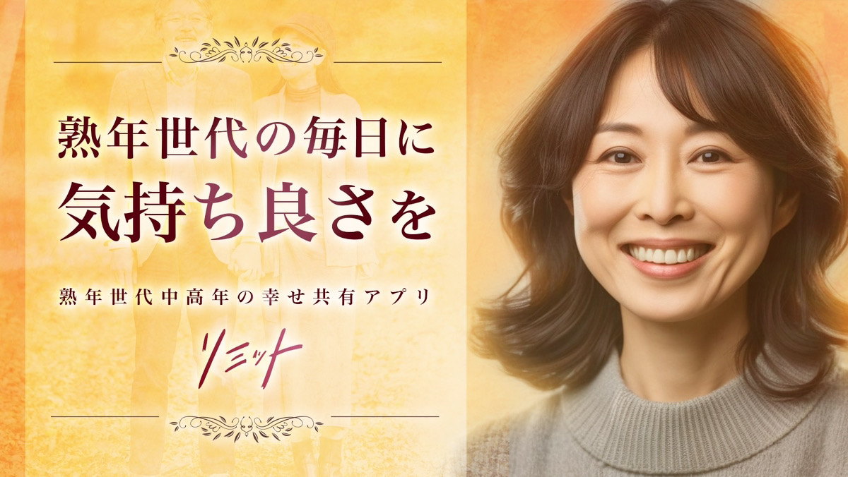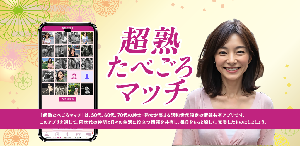 50代、60代、70代の紳士・熟女の熟年世代が出会い、マッチングしチャットする秘密の匿名アプリ!人生の「食べごろ」、最も充実し楽しむべき時期である今を満喫しましょう!